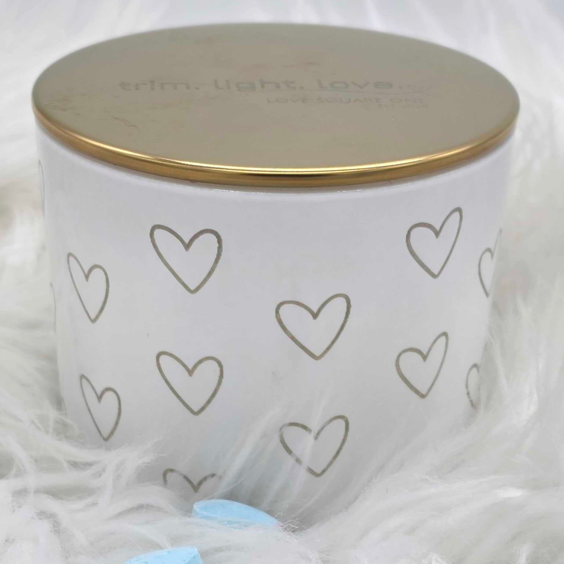 Jar: White glass with laser engraved hearts and gold lid. White box packaging